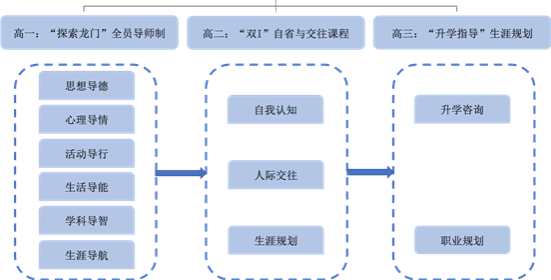 高一阶段全员导师制协助学生全方位适应高中学习生活,关注德智体美劳全面发展。高二阶段的“双I(Intrapersonal intelligence & Interpersonal intelligence)”自省与交往课程引领学生认识自我、提升交际能力,聚焦志趣,激发潜能。高三阶段的生涯规划辅助学生根据职业倾向和职业理想科学规划未来,选择合适的大学专业。